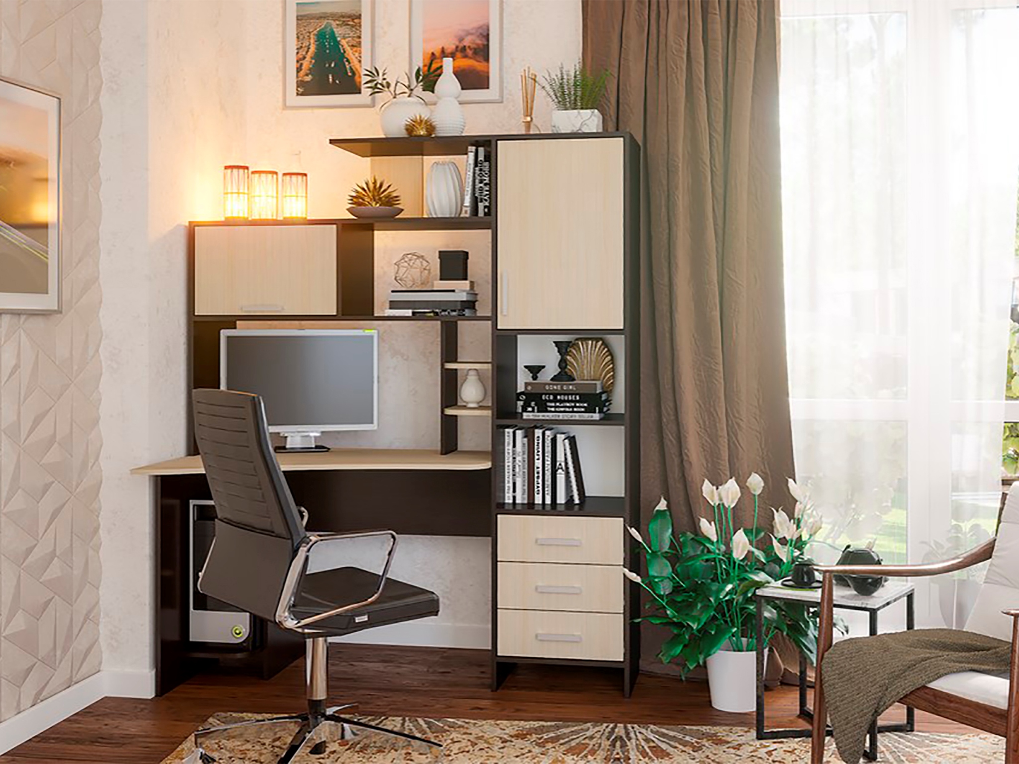 Комплектация включает угловой компьютерный стол Мори МС-16 левый и тумбу Мори МА900.1. Продуманная конструкция позволяет убрать лишние предметы, тем самым сохраняя единый стиль оформления помещения. Отсутствие ручек главное преимущество данной модели. Роль ручек выполняют сами фасады.