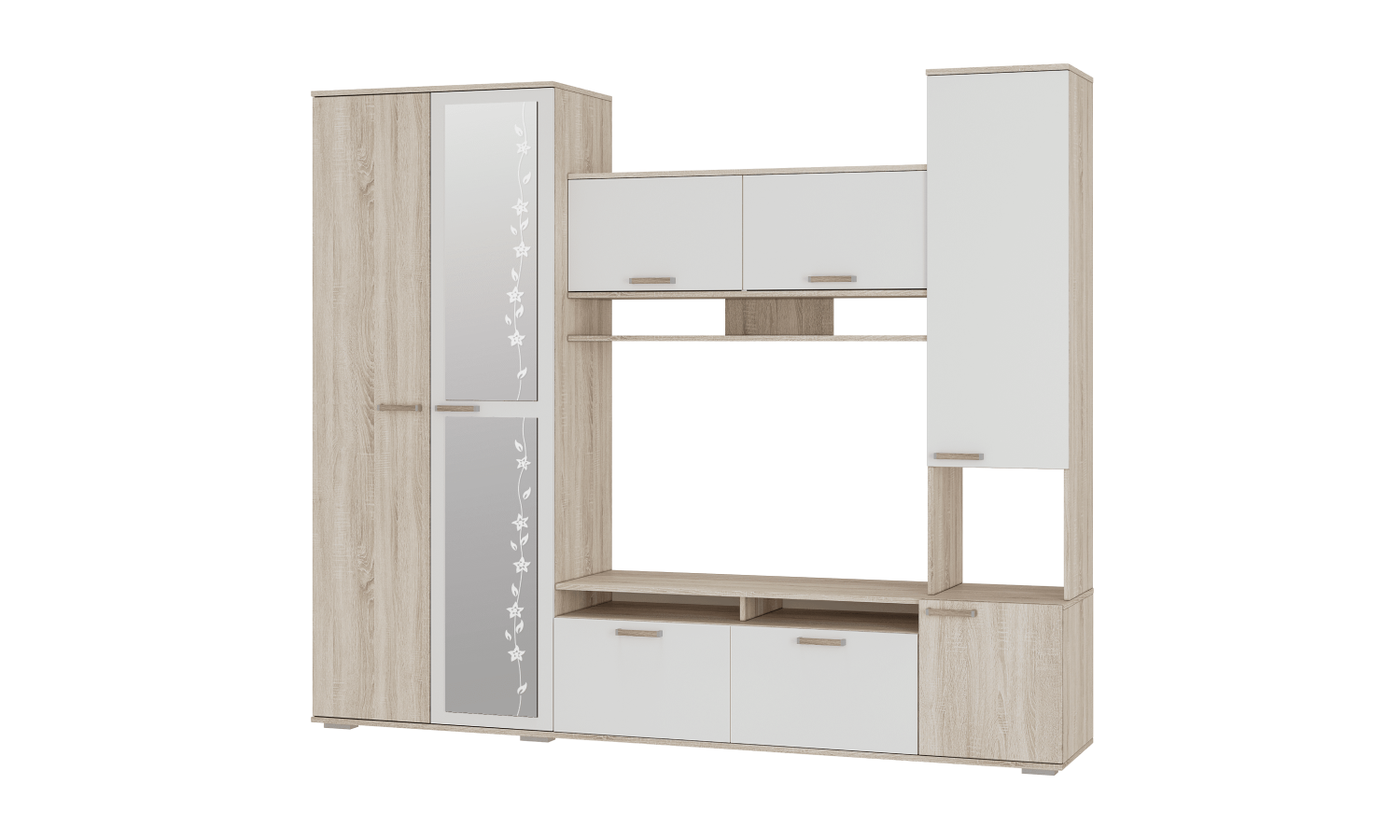 Особое внимание стоит уделить контрастному сочетанию фасадов белого цвета с древесной фактурой дуба сонома. Это сочетание создает эффектную игру света и тени, придавая интерьеру особую глубину и стильный вид. Кроме того, глянцевая отделка фасадов зеркалами добавляет в помещение дополнительного пространства и света, придавая ему элегантность и изысканность.