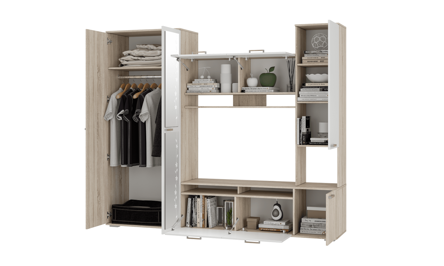 В компактном гарнитуре «Лукас» предусмотрены различные элементы для удобного хранения и эксплуатации. Широкие ящики и полки, а также открытые и закрытые отсеки позволяют упорядочить различные предметы, от книг и документов до посуды и аксессуаров. Благодаря продуманной компоновке элементов, все необходимые вещи всегда будут под рукой, а поверхность гарнитура можно использовать для различных целей – от оформления цветами и фоторамками до размещения электронной техники.