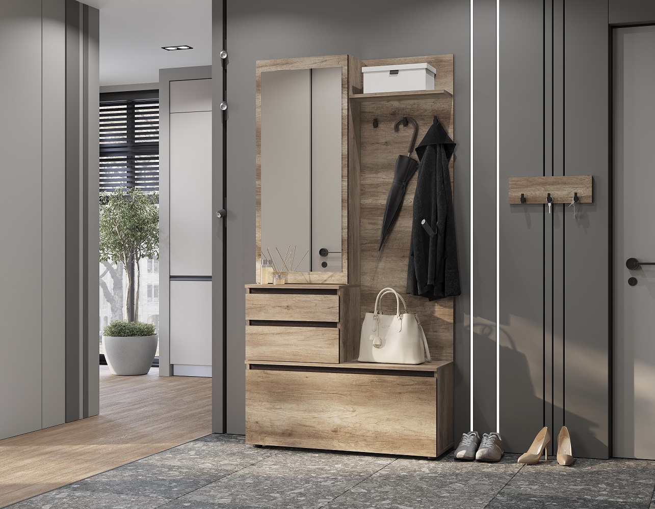 Благодаря универсальному дизайну и компактным размерам вешалка Токио впишется в малогабаритную прихожую или квартиру-студию. Наличие полок, надежные крючки и ниша под обувь позволят разместить верхнюю одежду, уличную и домашнюю обувь, сезонные аксессуары и головные уборы.