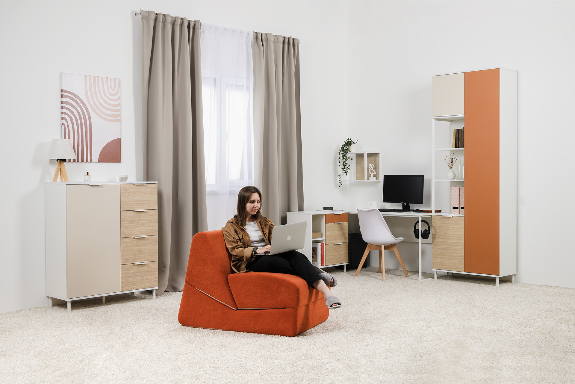Столешница и одна из опор ЛДСП, каркас стола металлический. Изделие установлено на пластиковые регулируемые подпятники.