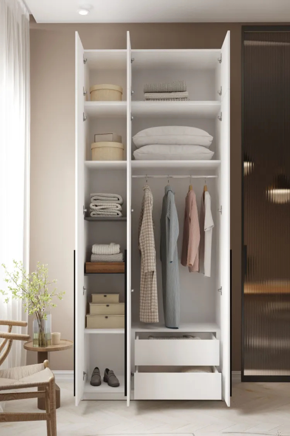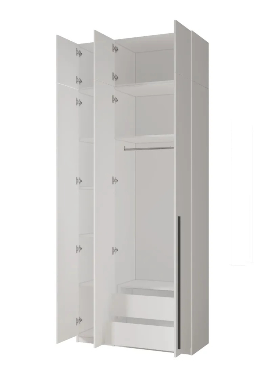 Эстетика этого 3-х дверного шкафа подчеркнута лаконичным и современным дизайном, который впишется в любой интерьер — от классического до минималистичного. Его нейтральный белый цвет делает шкаф универсальным предметом мебели, который станет ярким акцентом в вашем пространстве.