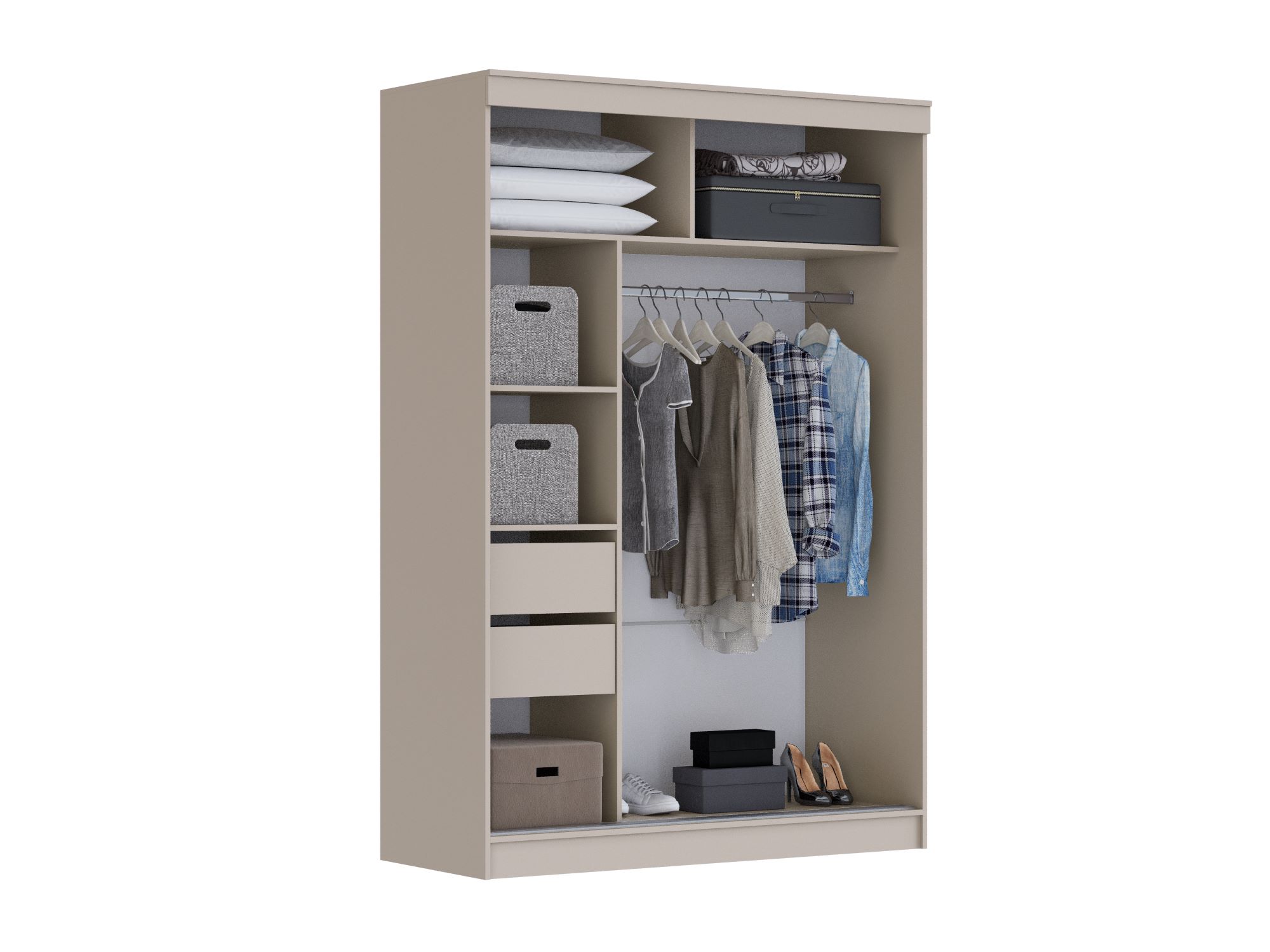 Просторные, вместительные полки, удобные штанги для одежды и дополнительные модули для обуви, аксессуаров или постельного белья.
