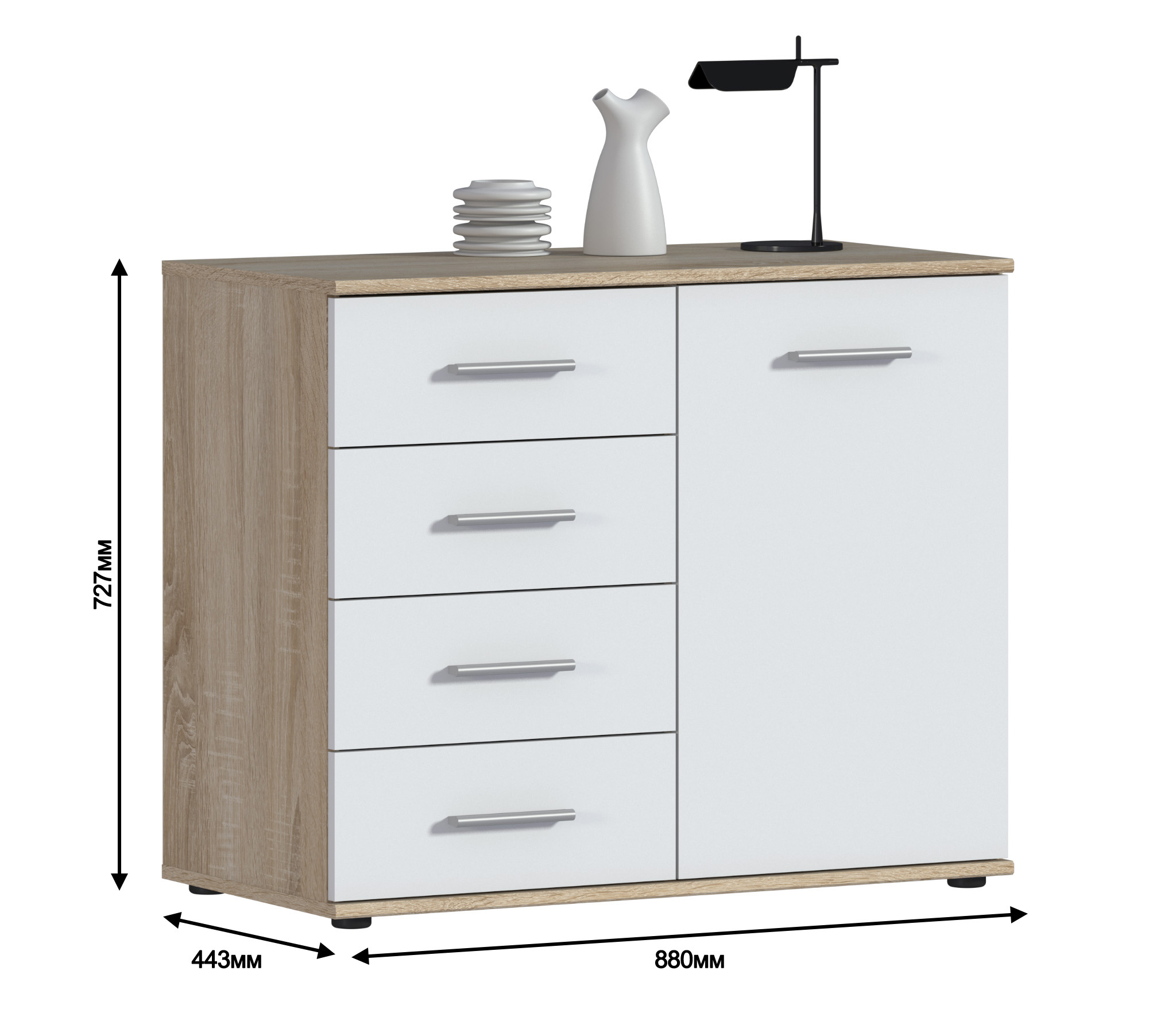 Комод выполнен в лаконичном дизайне, светлое покрытие фасадов позволяет смотреться этому предмету мебели стильно и не громоздко.