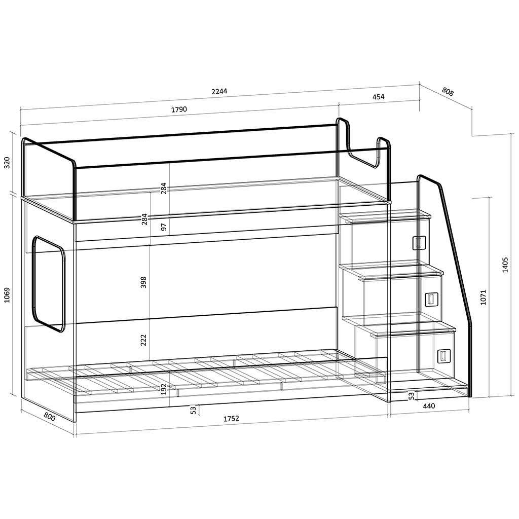 Классическая невысокая двухъярусная кровать с двумя параллельными спальными местами размером 1750х750.