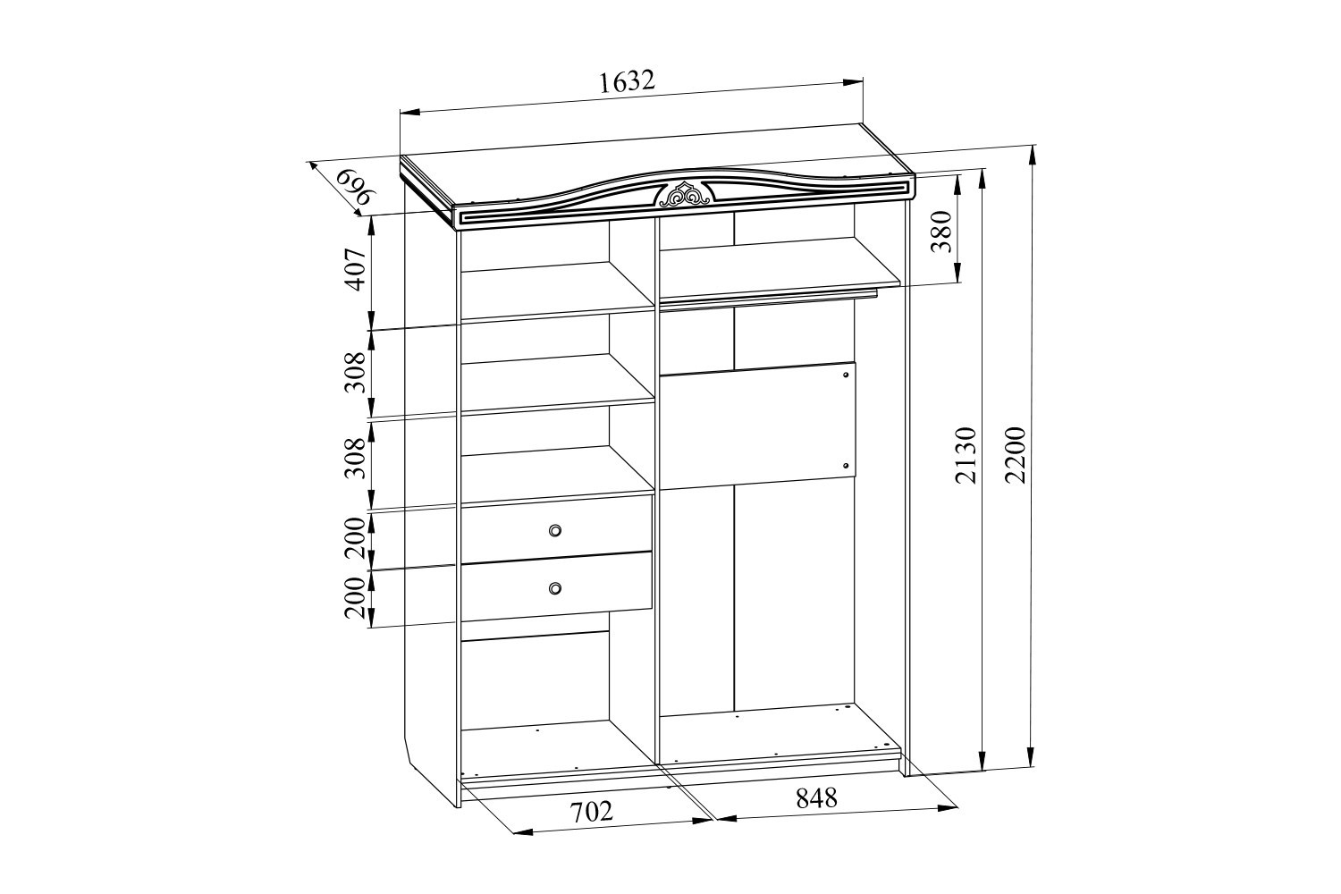 Шкаф -купе с МДФ фасадом. В левой части шкафа установлены три полки для сложенных вещей и два выдвижных ящика.