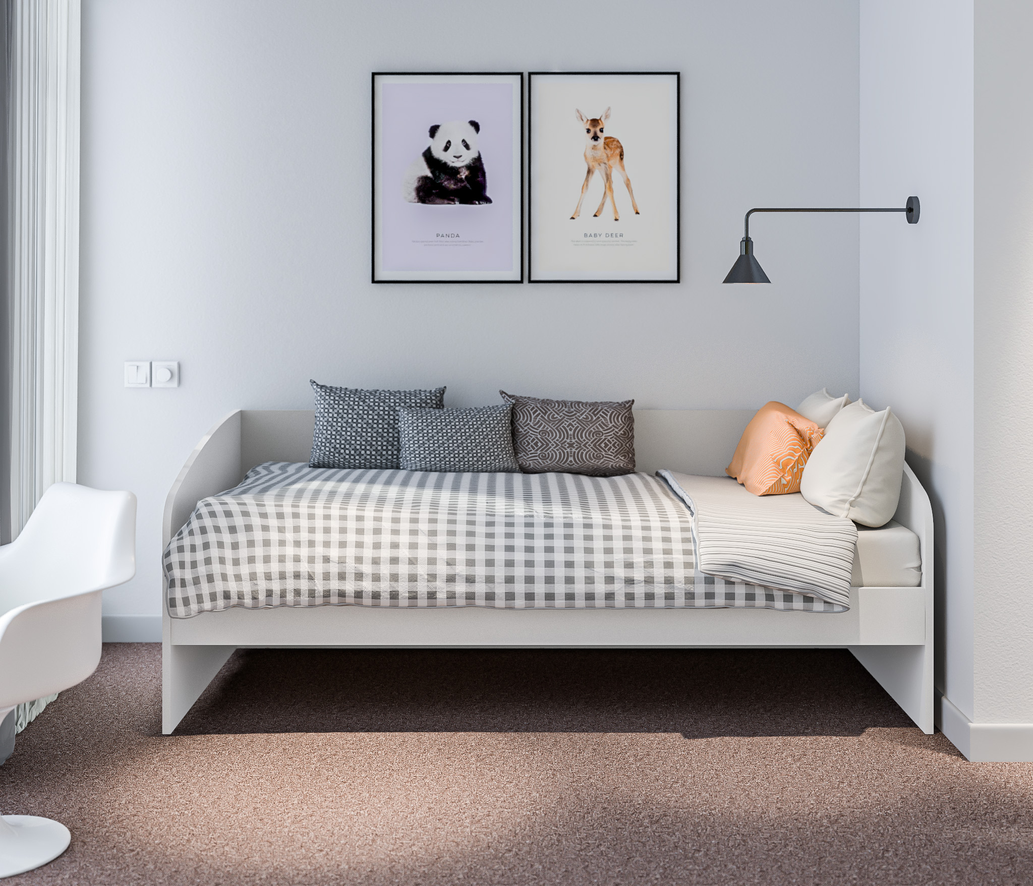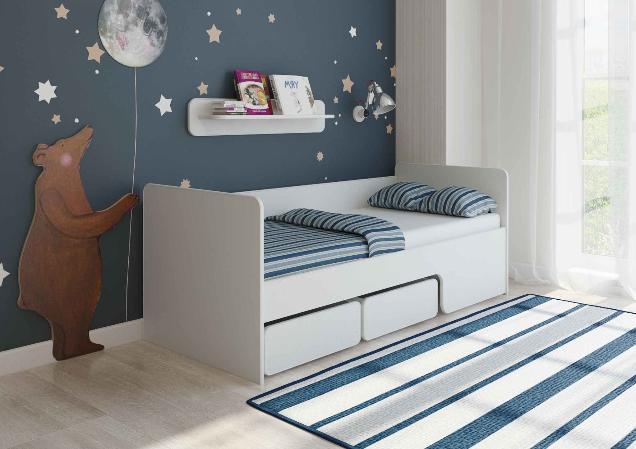 Кровать из детского гарнитура «Мамбо» – симпатичная и комфортабельная модель, воспользоваться которой могут даже взрослые члены семьи. Занимая не так уж и много места, она выделяется своей функциональной значимостью. Три в одном. Днем это вполне приличный диванчик, ночью полноценное спальное место шириной 95 см, к тому же, это и система хранения постельных принадлежностей, так как модель оборудована двумя объемными выдвигающимися ящиками. Кровать собрана из мебельных щитов повышенной прочности с износостойким поверхностным покрытием приятного пастельного оттенка «Дуб Сонома». Ящики и фасады к ним изготовлены из ДСП песочного цвета. Неброское сочетание цветов вносит в интерьер гармонию и умиротворение, что бывает нелишним, когда требуется успокоить разыгравшегося ребенка.