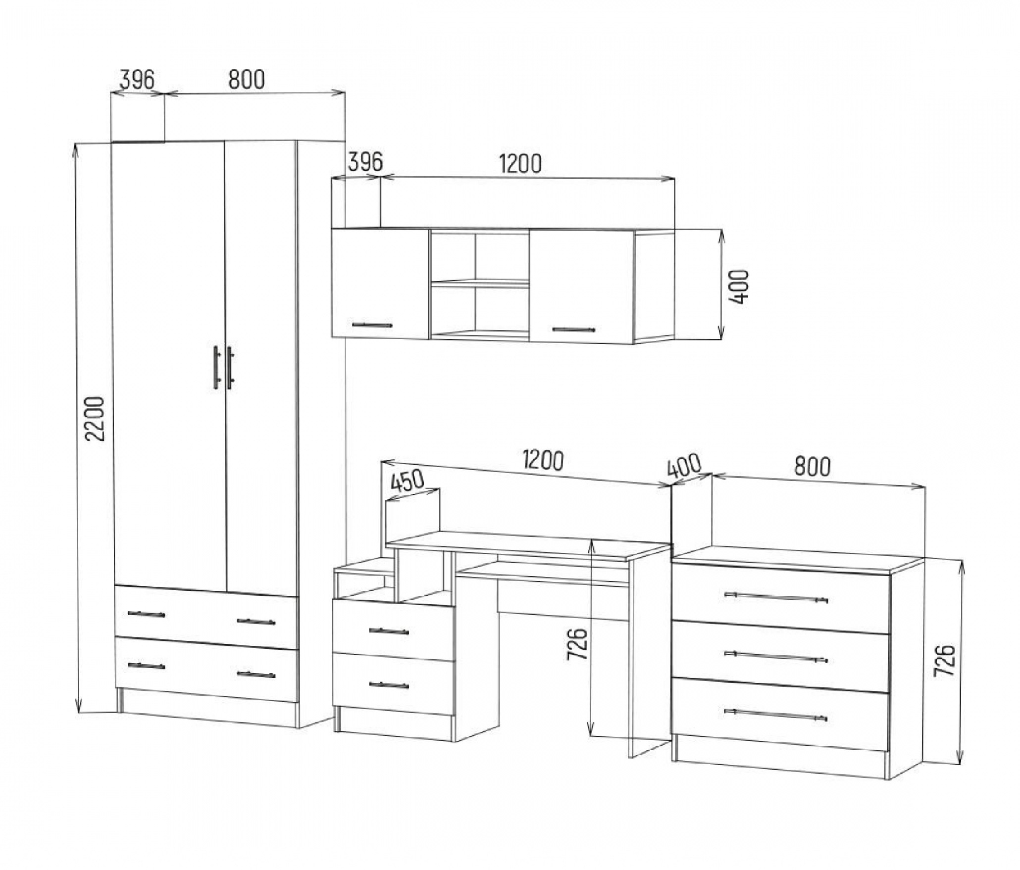 •шкаф 2-х дверный: 2 ящика, выдвижная штанга, антресольная полка, секция с 3 полками (800х400х2200);