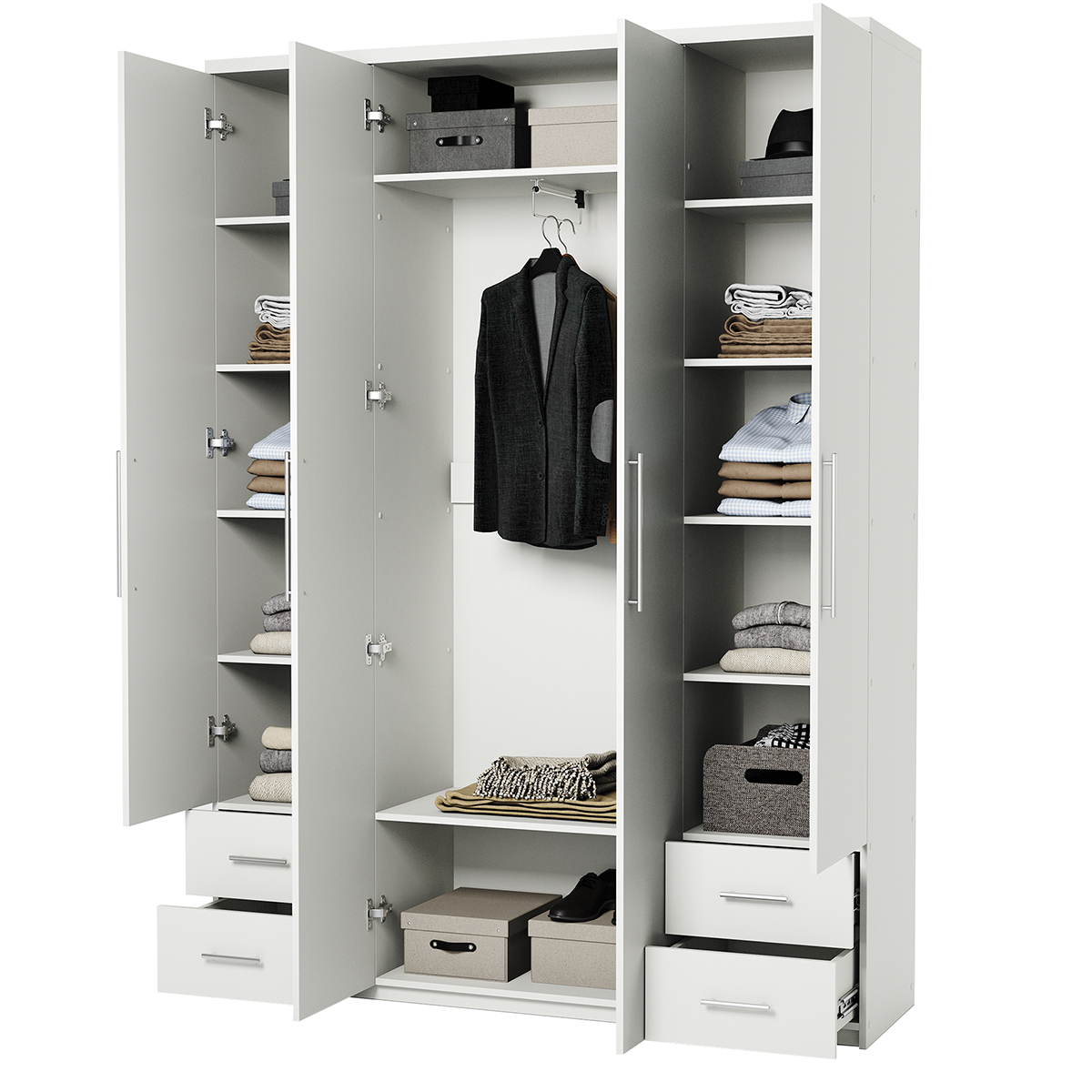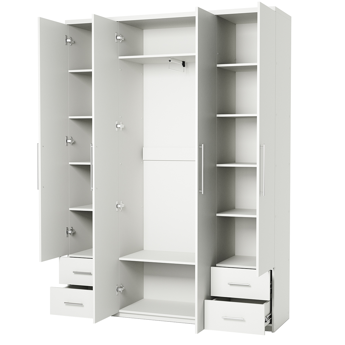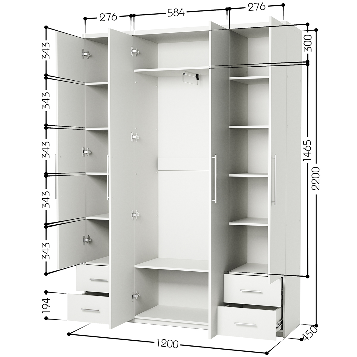 Габариты внешние: ширина 1200 мм. глубина 450 мм. высота 2200 мм., Гарантия: 18 месяцев, Выдвижная штанга для вешалок: да, Страна производства: Россия, Материал корпуса: ЛДСП, Количество дверей: 4,Зеркало в дверце: нет, Тип шкафа: для одежды, Требуется сборка: да Наполнение шкафа комбинированный полки и штанга. Изделие выполнено из высококачественной ЛДСП отечественного производства. Края отделаны кромкой ПВХ 2 мм. Изделие поставляется в разобранном виде. В комплект входит инструкция. Корпус ламинированная ДСП, Задняя стенка ДВП, Тип шкафа линейный (прямой).
