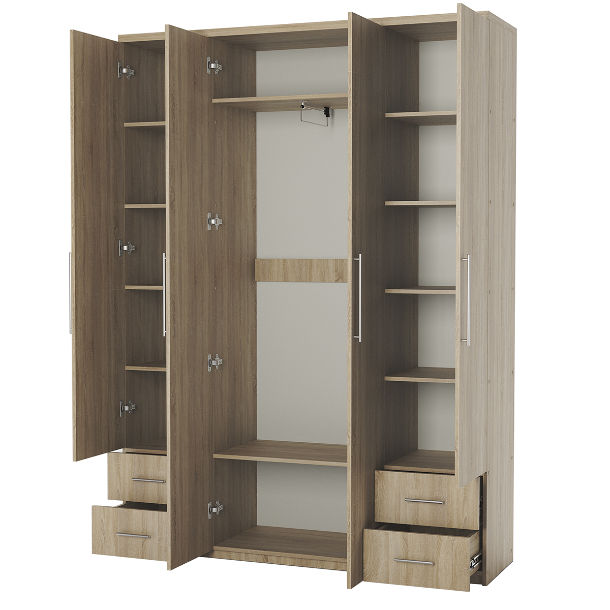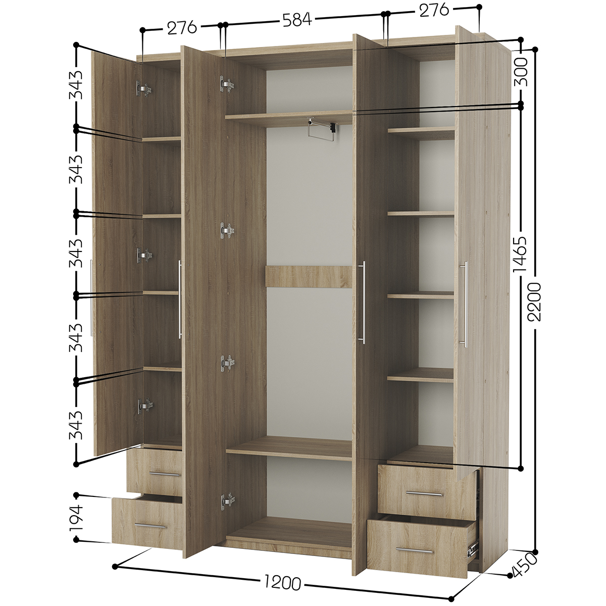 Габариты внешние: ширина 1200 мм. глубина 450 мм. высота 2200 мм., Гарантия: 18 месяцев, Выдвижная штанга для вешалок: да, Страна производства: Россия, Материал корпуса: ЛДСП, Количество дверей: 4,Зеркало в дверце: нет, Тип шкафа: для одежды, Требуется сборка: да Наполнение шкафа комбинированный полки и штанга. Изделие выполнено из высококачественной ЛДСП отечественного производства. Края отделаны кромкой ПВХ 2 мм. Изделие поставляется в разобранном виде. В комплект входит инструкция. Корпус ламинированная ДСП, Задняя стенка ДВП, Тип шкафа линейный (прямой).