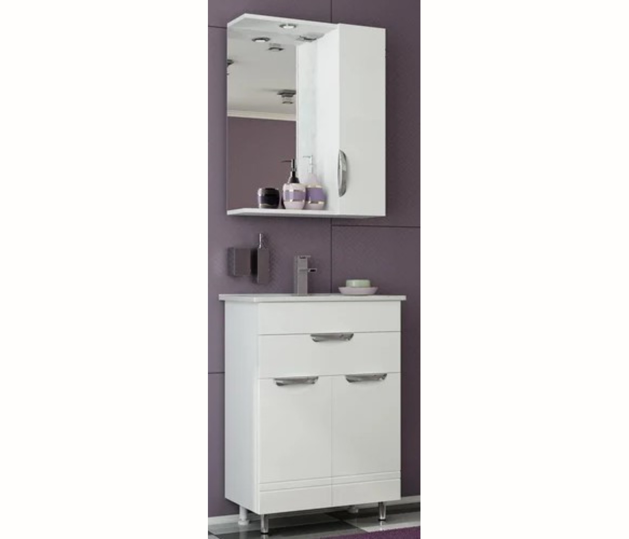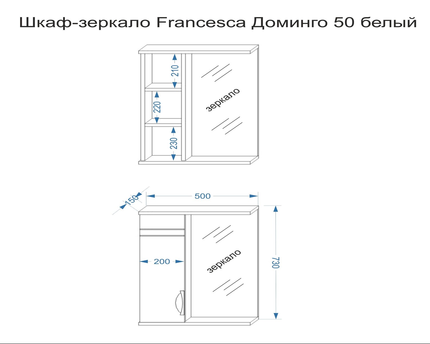 Полезным функциональным элементом в обстановке ванной комнаты станет оформленный в современном стиле шкаф-зеркало Francesca Avanti Доминго 50. В компактной конструкции совмещен оборудованный распашной дверью навесной шкафчик с внутренними полками и удобное зеркало, установленное в окружении карниза со встроенным светильником вверху и открытой полочки для аксессуаров ежедневного использования внизу. Компания «Франческа» поставляет данную модель также в составе комплекта мебели для ванных комнат. Характерной чертой в оформлении является окраска в белый цвет и стильные хромированные ручки.