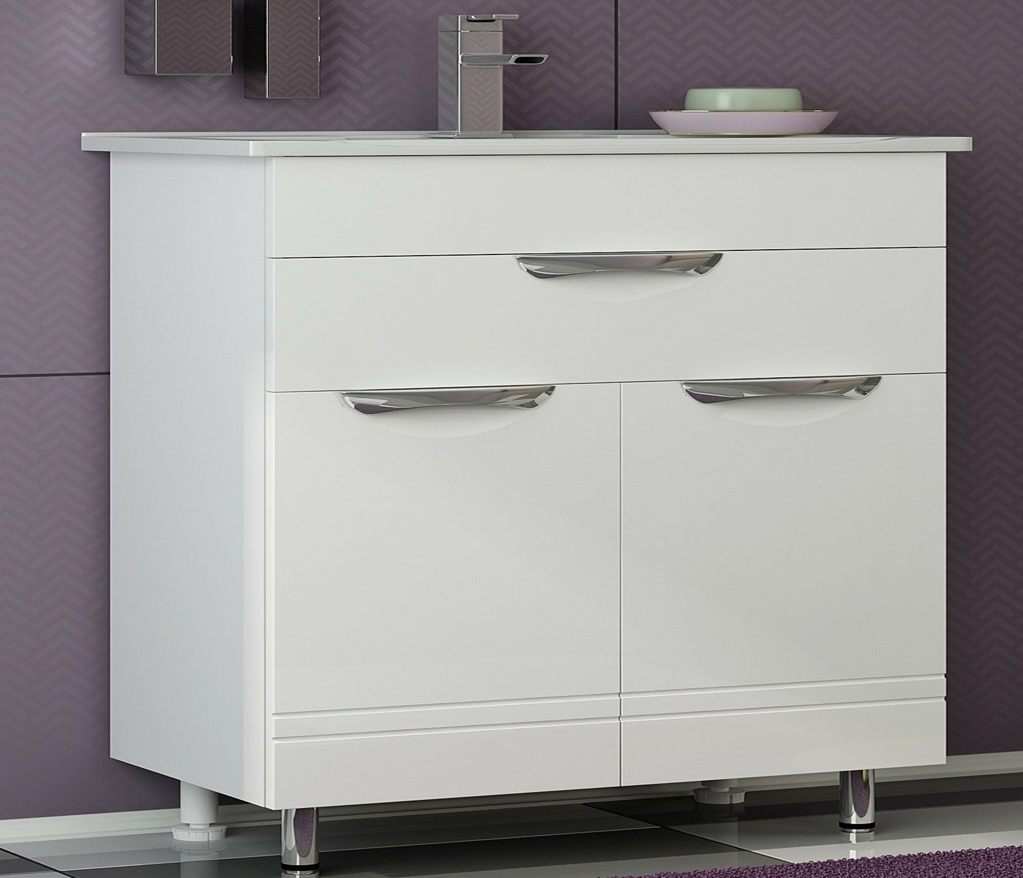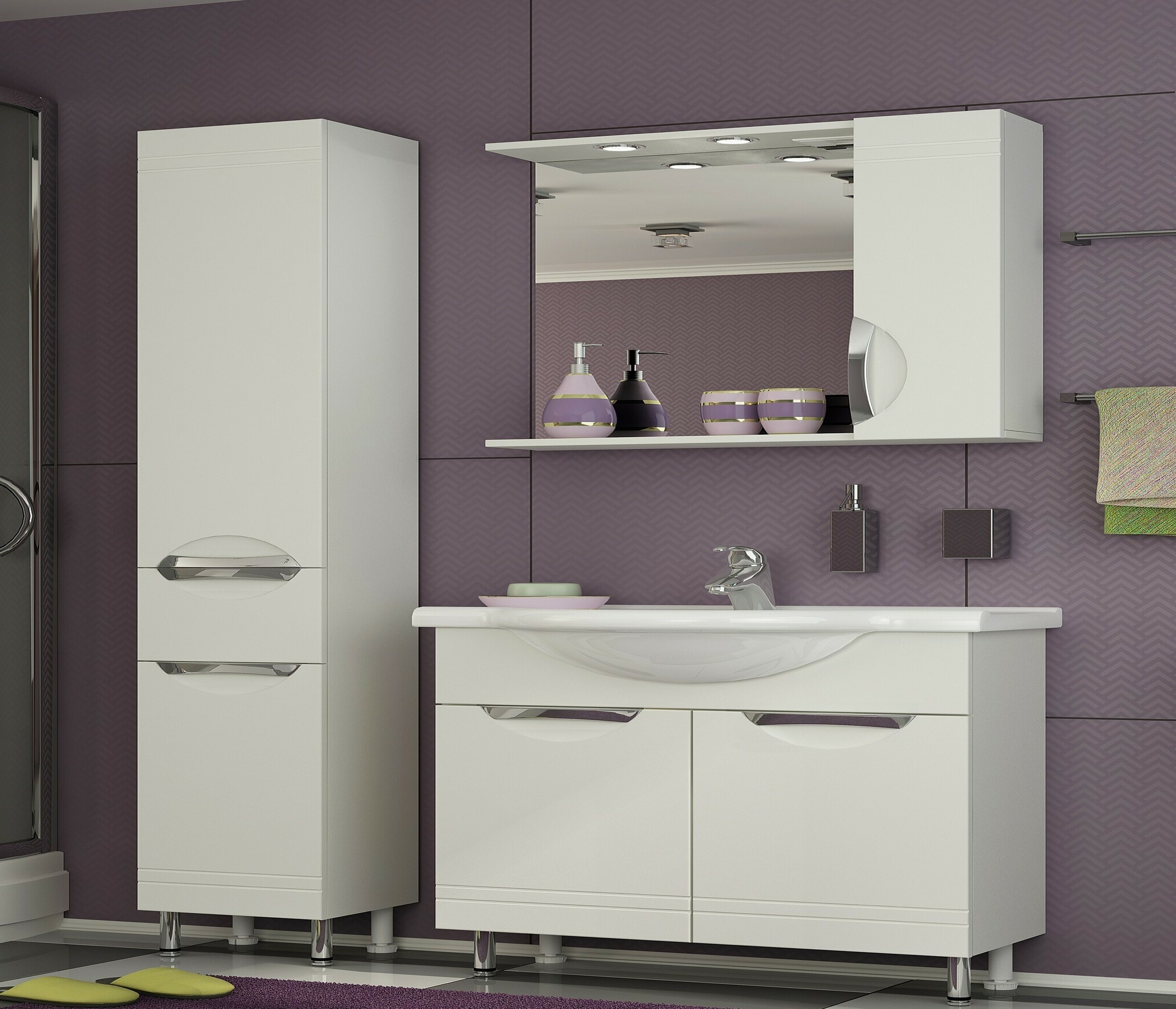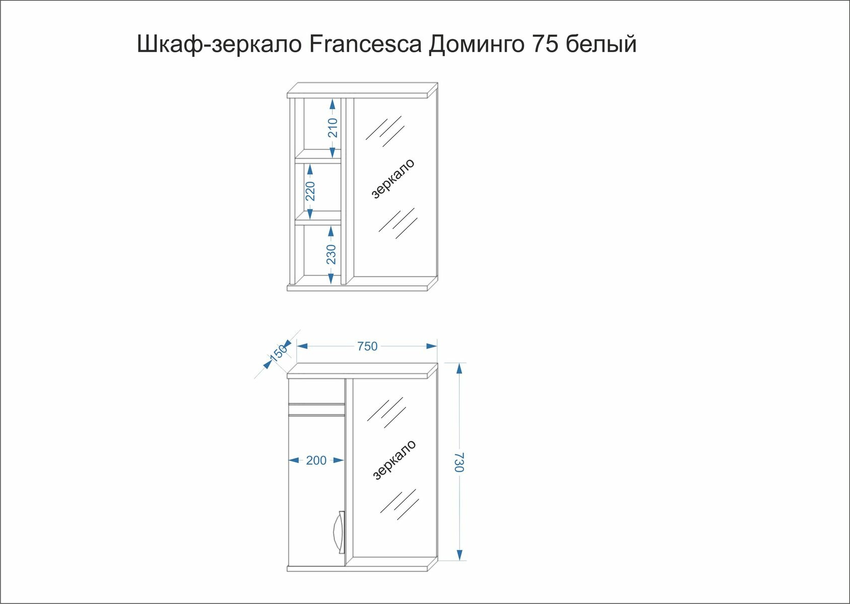 Полезным функциональным элементом в обстановке ванной комнаты станет оформленный в современном стиле шкаф-зеркало Francesca Avanti Доминго 75. В компактной конструкции совмещен оборудованный распашной дверью навесной шкафчик с внутренними полками и удобное зеркало, установленное в окружении карниза со встроенным светильником вверху и открытой полочки для аксессуаров ежедневного использования внизу. Компания «Франческа» поставляет данную модель также в составе комплекта мебели для ванных комнат. Характерной чертой в оформлении является окраска в белый цвет и стильные хромированные ручки.