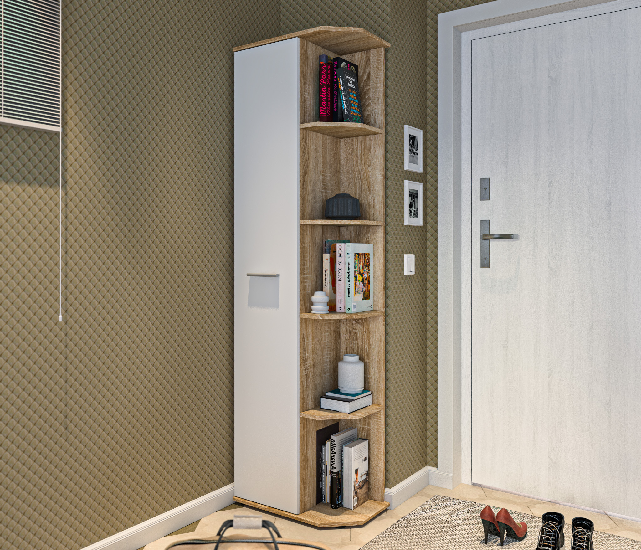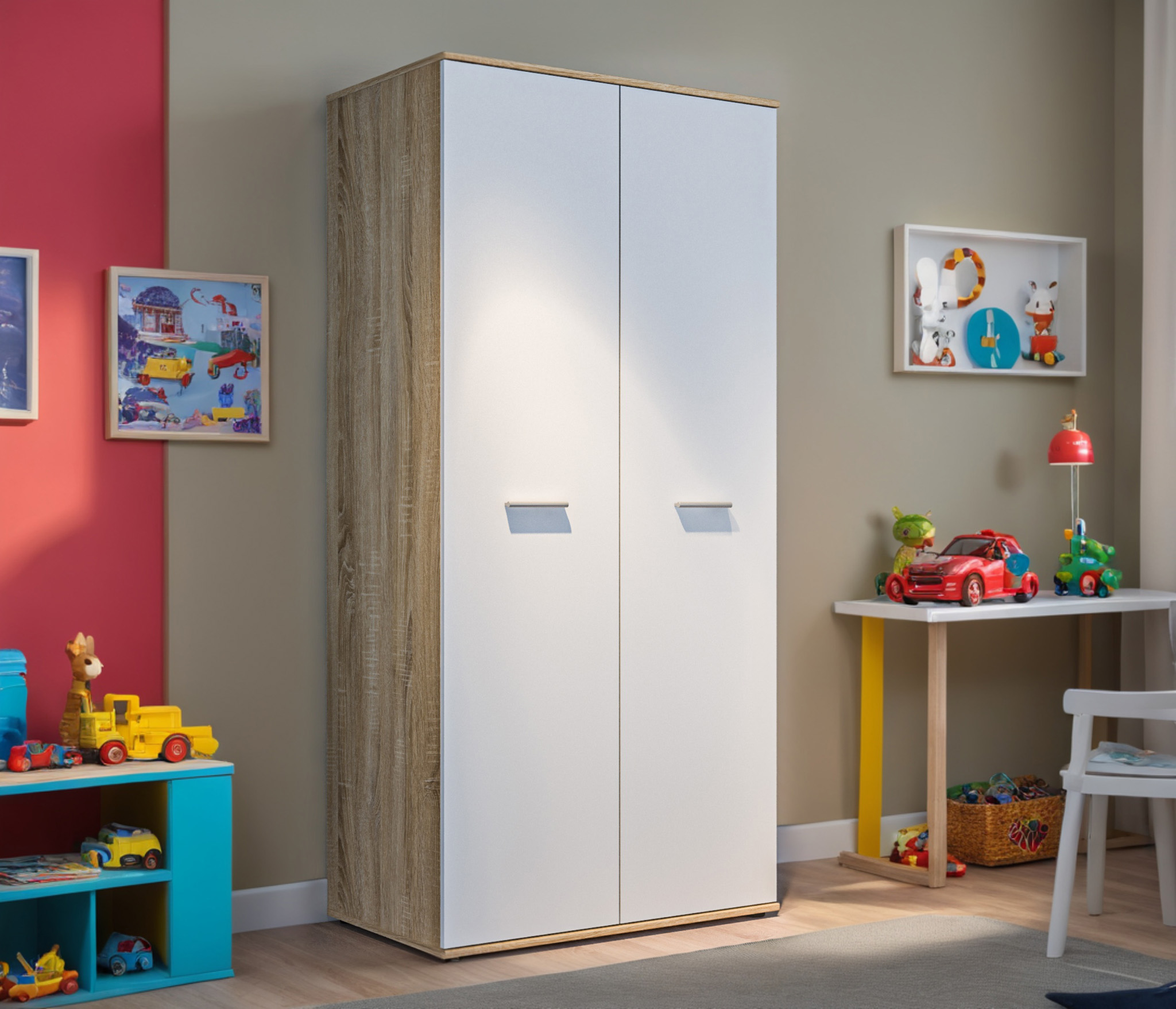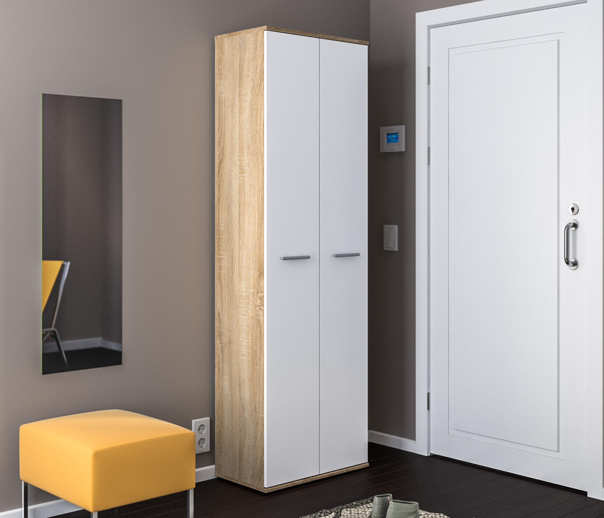 Оформление отделки комбинированное. Корпус выполнен в цвете «Дуб Сонома», фасадные поверхности – в белом цвете. Материал корпуса - КДСП, материал фасадов - ЛДСП.