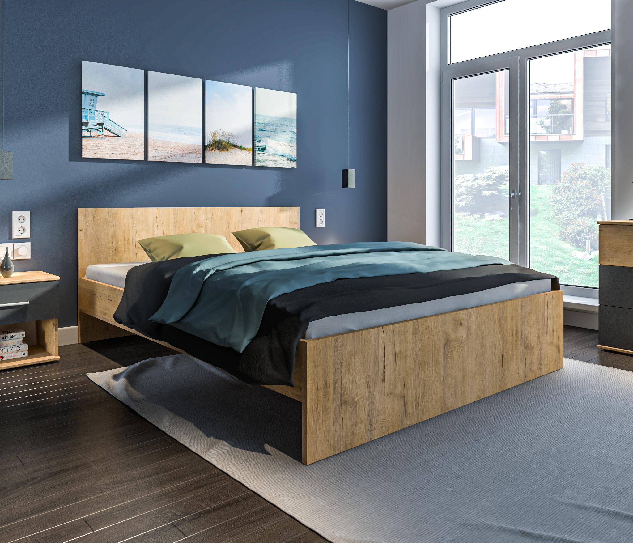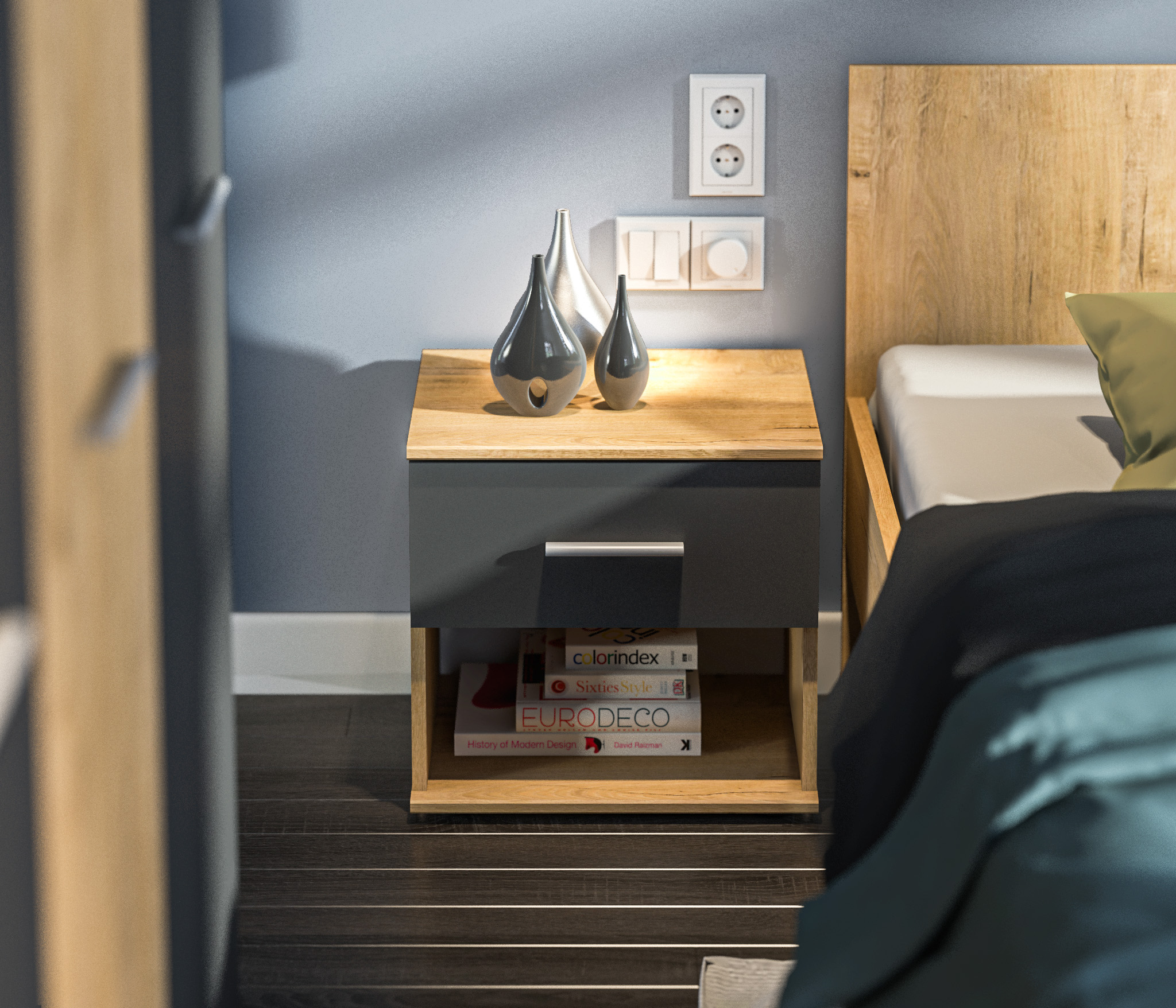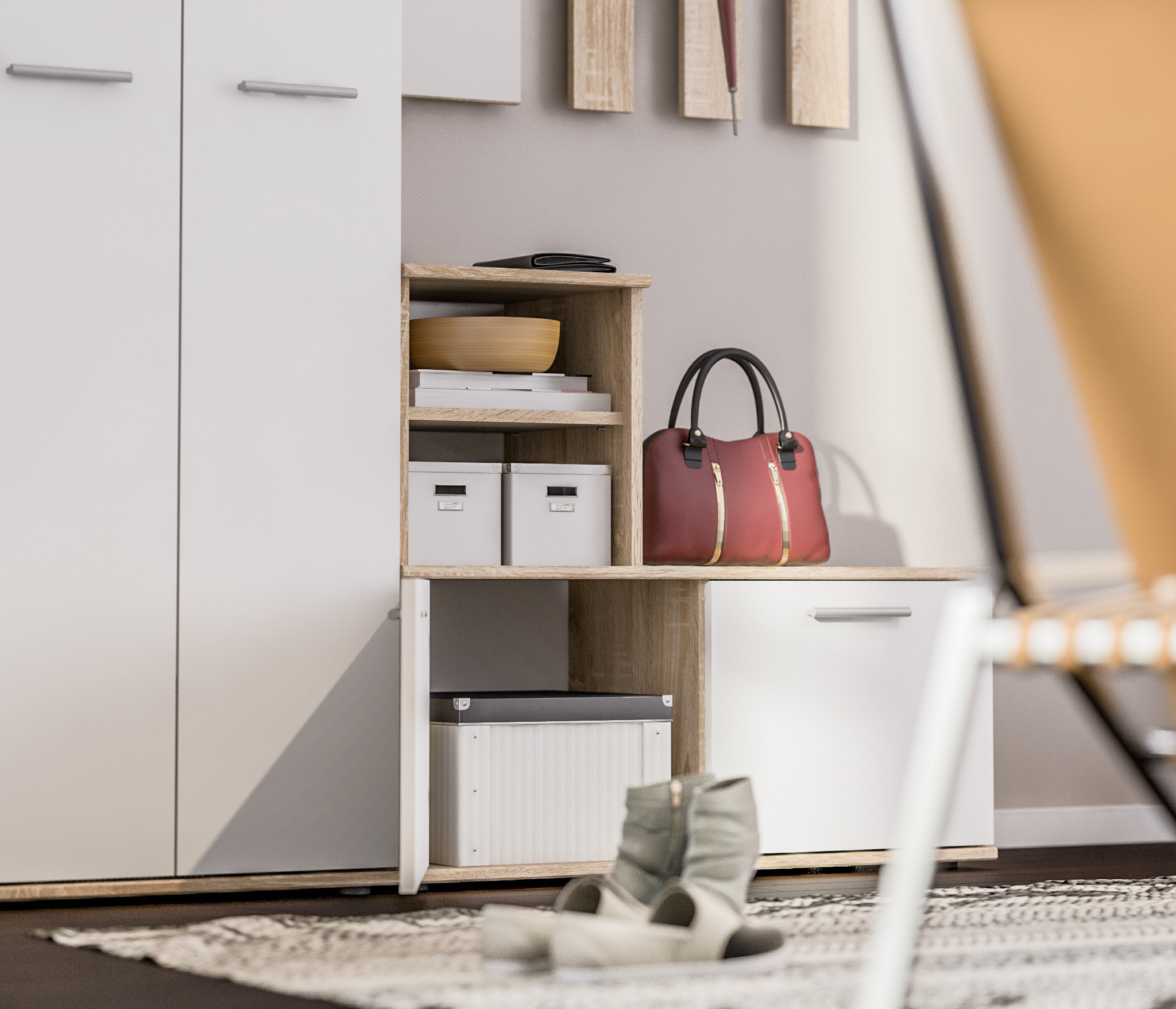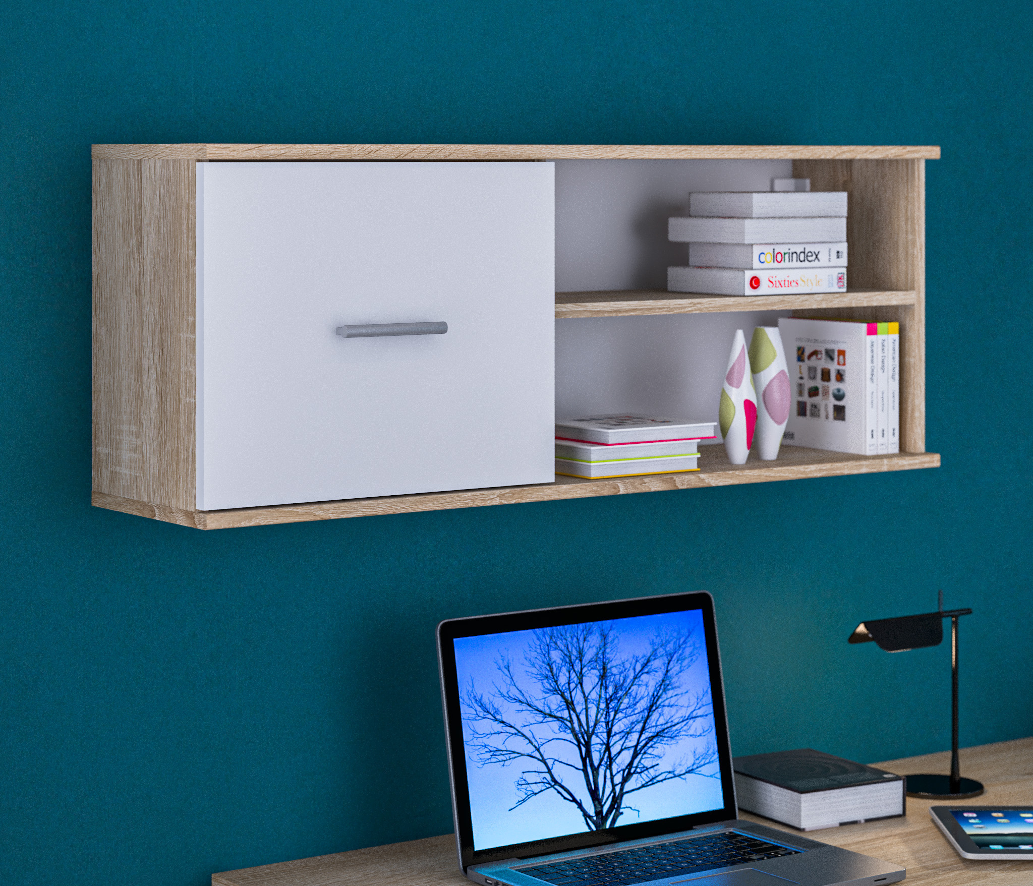 Оформление отделки комбинированное. Корпус выполнен в цвете «Дуб Сонома», фасадные поверхности – в белом цвете. Материал корпуса - КДСП, материал фасадов - ЛДСП.