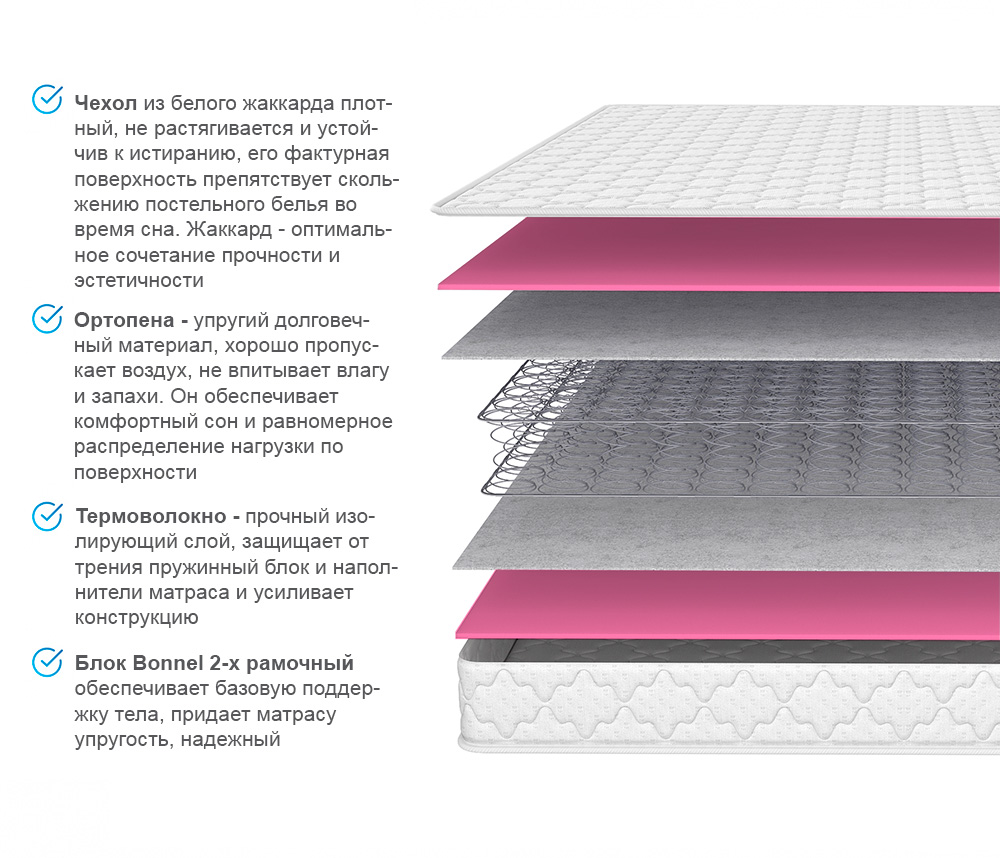 Ортопена в комфортном слое - упругий и долговечный материал, хорошо пропускает воздух, не впитывает влагу и запахи. Он обеспечивает комфортный сон и равномерное распределение нагрузки по поверхности.