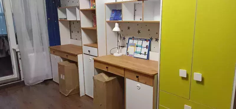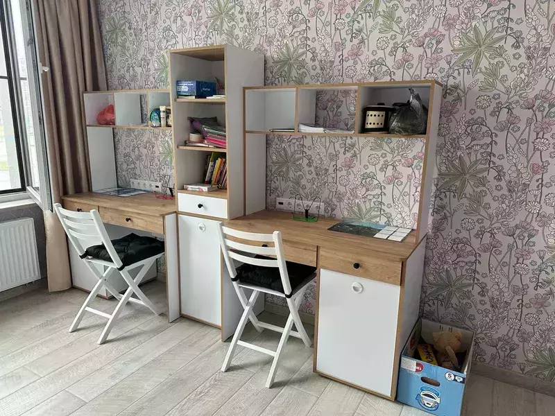 Детская мебельная стенка для двоих детей состоит из двух столов письменных Вуди 12.42 с надстройками Вуди 13.161 и пенала Вуди 13.146. Вместительная столешница, под ней тумба и выдвижной ящик - есть всё для плодотворной работы. Тумба стола имеет удобное распашное отделение с полкой внутри и ящик над ним. Стол имеет универсальную сборку - сторону расположения тумбы Вы определяете сами при сборке. В комплекте 2 стола. На столещницах расположены надстройки Вуди 13.16. Это классическая надстройка с широкой полкой, разделенной на 3 отделения. В нижней части надстройки имеется дополнительная царга, что делает надстройку более жесткой и надежной. Пенал оборудован в верхней части двумя полками, по центру выдвижным ящиком и снизу распашной дверкой с полочкой за ней. Корпус и фасады мебели изготовлены из экологически чистой ламинированной ДСП 16 мм., торцы окромлены ПХВ плёнкой 0,4 мм. Лицевая фурнитура выполнена из черного пластика, фасады дверки открывается за вырез по центру. Распашная дверь на четырёхшарнирных петлях без доводчиков, при сборке можно собрать на удобную для Вас сторону открывания. Выдвижные ящики на шариковых направляющих полного выдвижения обеспечивают длительную и тихую эксплуатацию. Изображения детской мебельной стенки для двоих детей Вуди Вы можете найти выше в начале страницы. Детская мебельная стенка для двоих детей Вуди - элементы из набора мебели для молодежной комнаты Вуди.