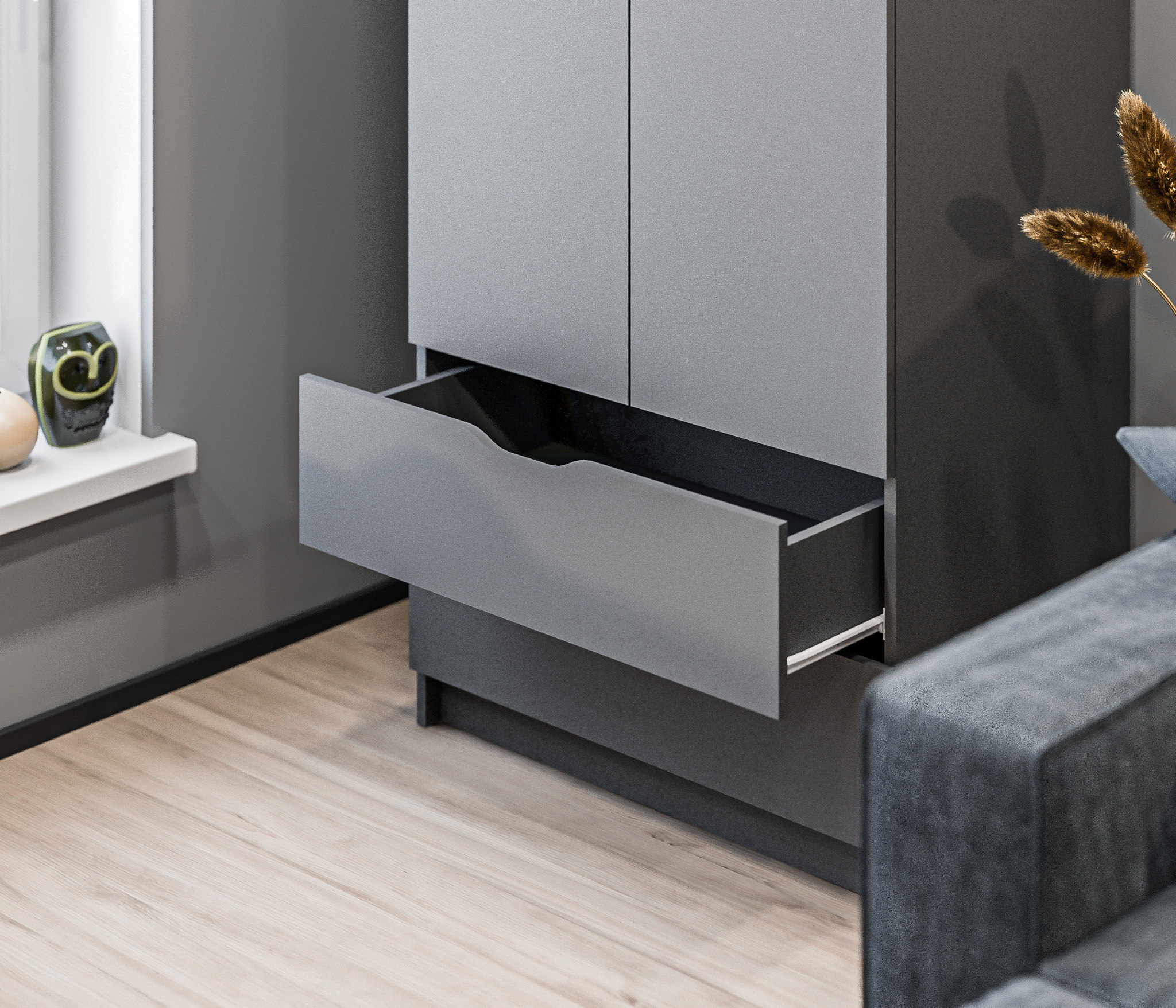 Дверцы шкафа не имеют ручек добавляют минималистичность в его дизайн.