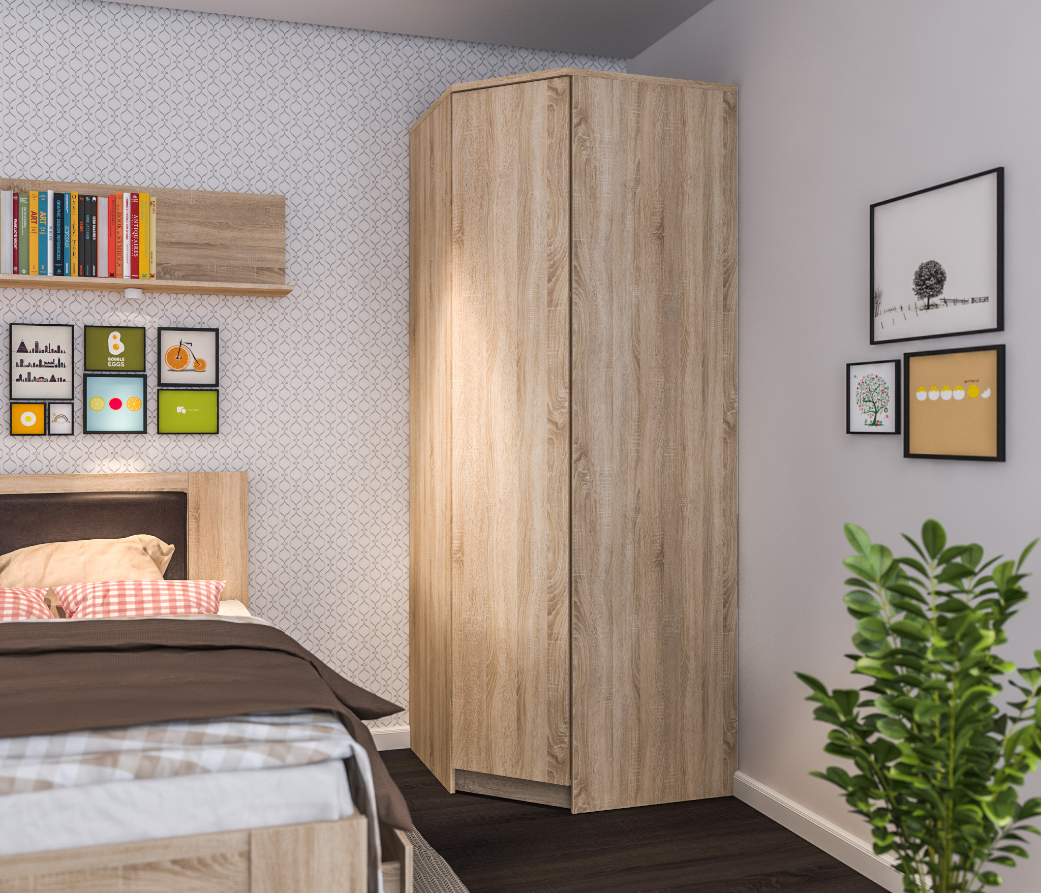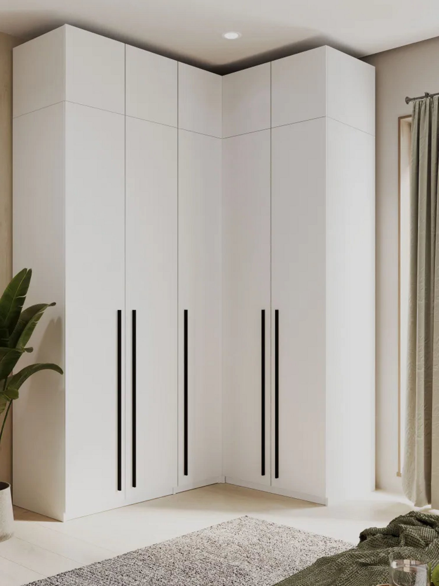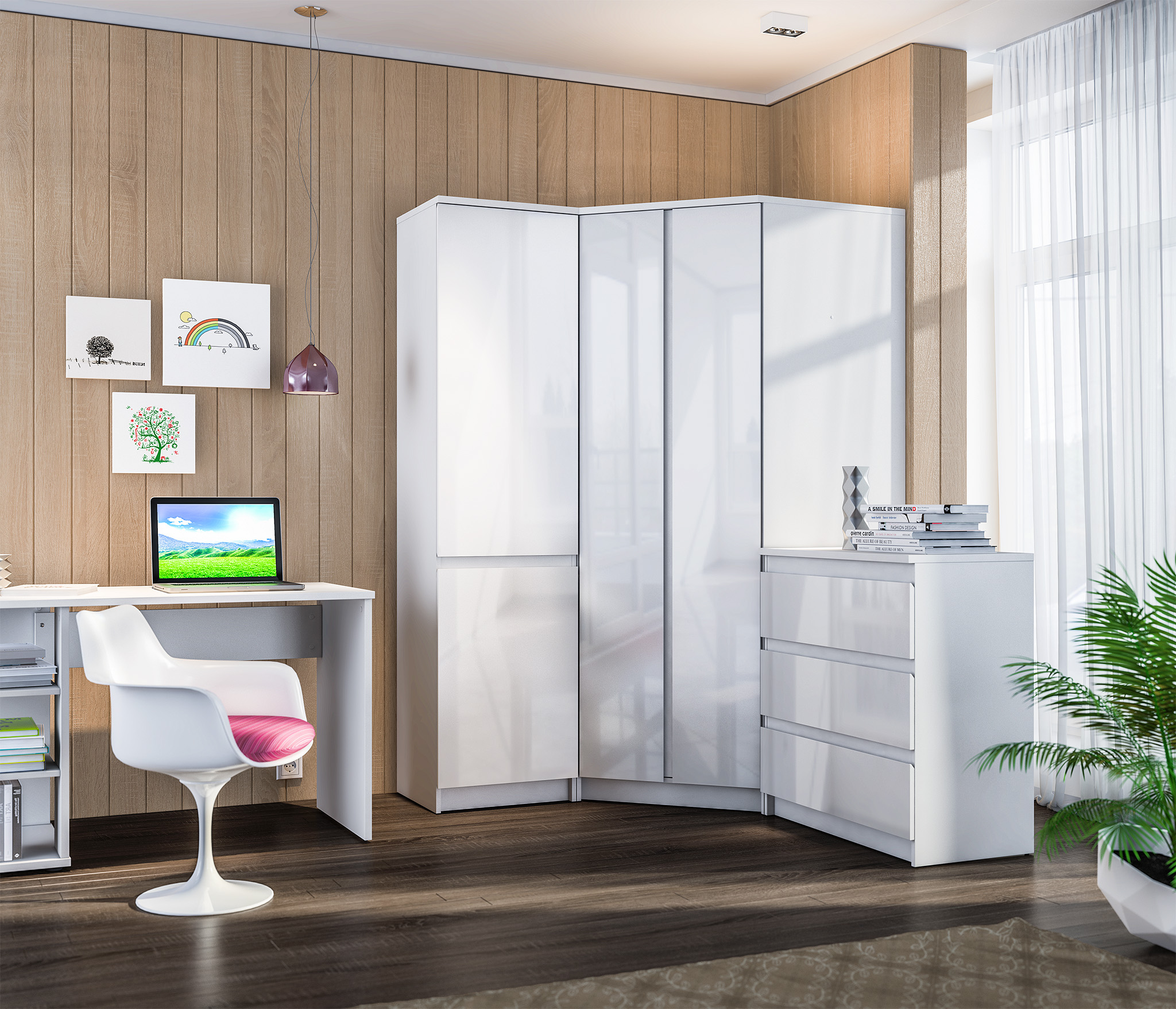 Вместительный шкаф угловой конфигурации с широкой стационарной штангой и комплектом полок. Идеально сочетается с остальными шкафами коллекции Софт в составе шкафной группы.