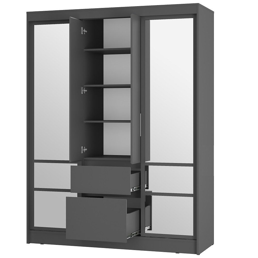 Минималистичный шкаф-купе с разноплановым наполнением. Оснащен 2-мя стационарными хромированными штангами, комплектом полок и двумя выдвижными ящиками на направляющих полного и плавного выдвижения. Зеркальный фасад визуально облегчает окружающее пространство и помогает держать внешний вид под контролем.